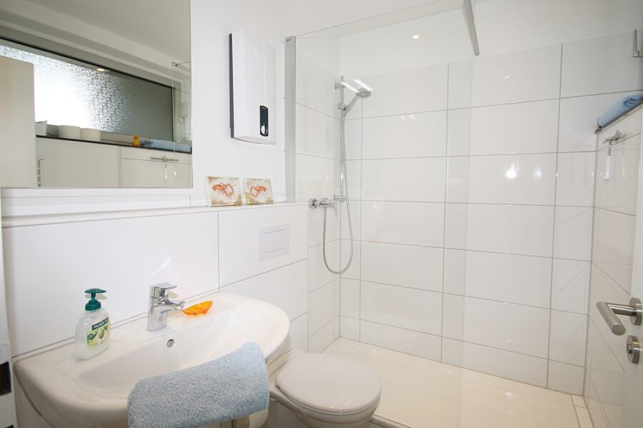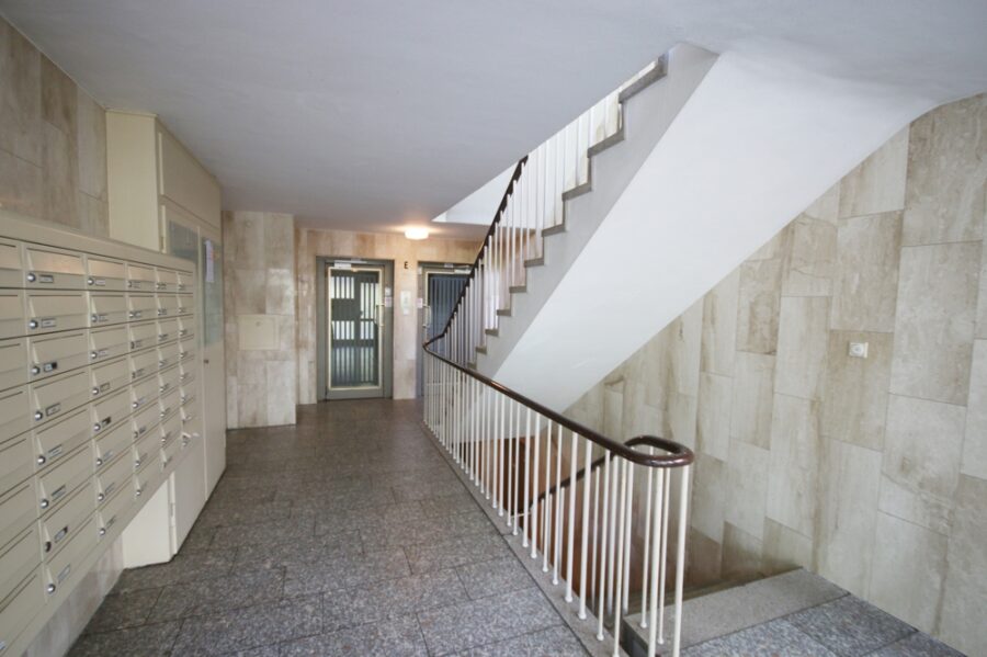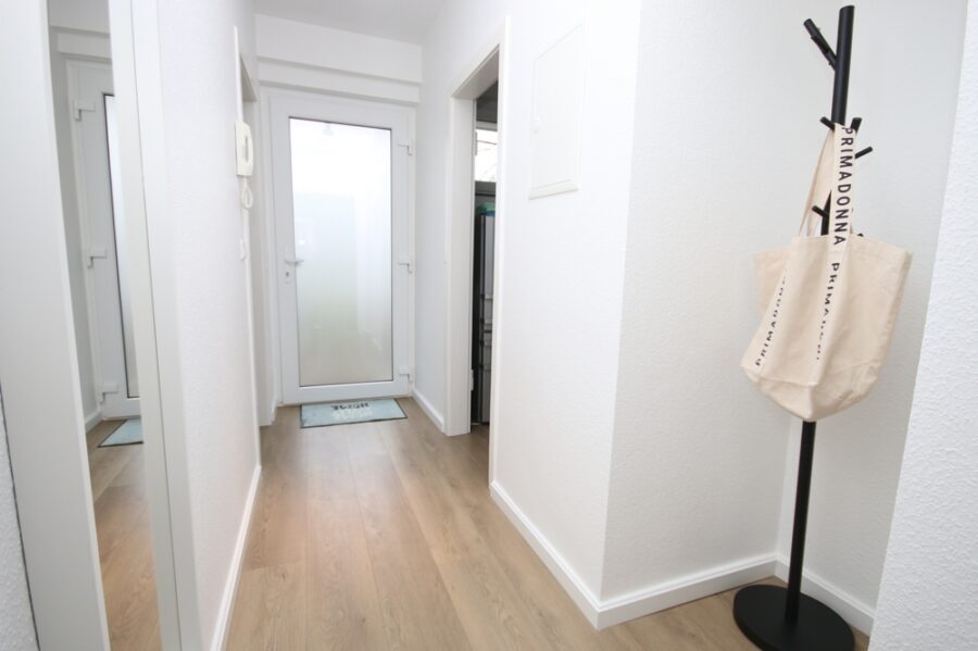 Über das Treppenhaus oder bei Bedarf auch mit dem Aufzug erreichen Sie bequem Ihr neues Zuhause. Vom hellen und freundlichen Flur gelangen Sie links in Ihre Küche. Sie ist komplett und löffelfertig ausgestattet. Spülmaschine, Mikrowelle und ein großer Gefrierkühlschrank bieten wünschenswerten Komfort. Das gegenüberliegende Tageslicht-Bad ist sehr modern und verfügt über eine große, mit Glaswand abgetrennte Dusche, Toilette, Waschtisch und Handtuchheizkörper.