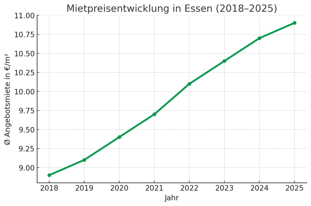 Die folgende Entwicklung zeigt, wie sich die durchschnittlichen Angebotsmieten in Essen in den letzten Jahren verändert haben und welche Trends Vermieter im Blick behalten sollten.